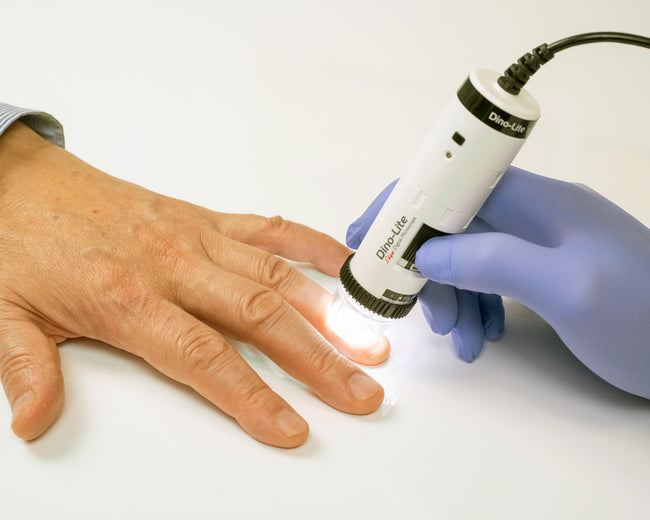 The Dino-Lite Edge 1.3MP HF4115-N2UT(W) uses a special curved cap for easy viewing of capillaries at 50x and 200x which can aid medical professionals in early diagnosis of various diseases by examining the capillary vessel of fingers. The new modular wireless-ready design allows for USB connection or a quick swap to wireless with a WF-20 adapter (sold separately) making it a completely cordless and portable microscope and includes the popular FLC feature. This nailscope can be used as a handheld microscope or with a stand with a range of 10x - 200x. Included with this Dino-Lite is the curved cap (N3C-N) designed to fit comfortably over a fingernail for capillary viewing as well as a sealed cap (N3C-C) that can protect the inner component and lens of the Dino-Lite and offer options for viewing skin with oil immersion.