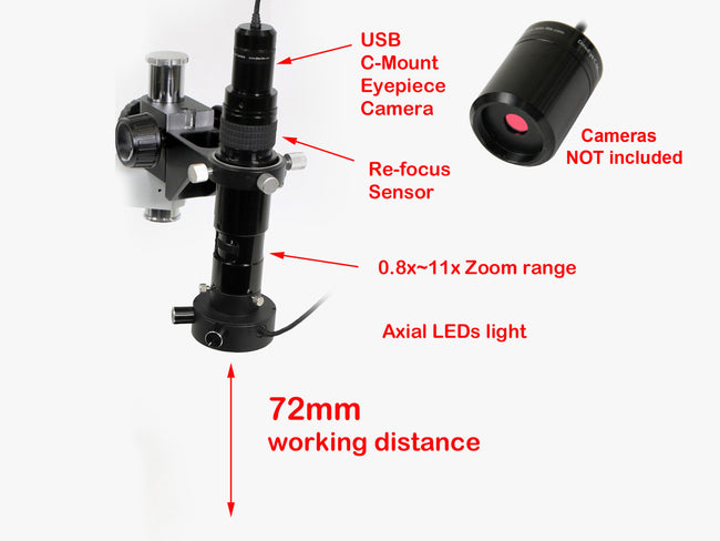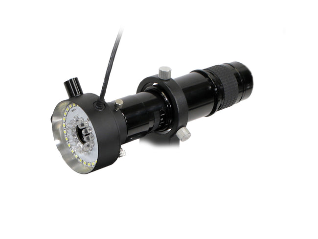Depending on the sensor size of your camera you can receive various magnification. This model includes an attachment white LED ring light with dimmer to provide optimal lighting conditions that are powered via AC Adapter.