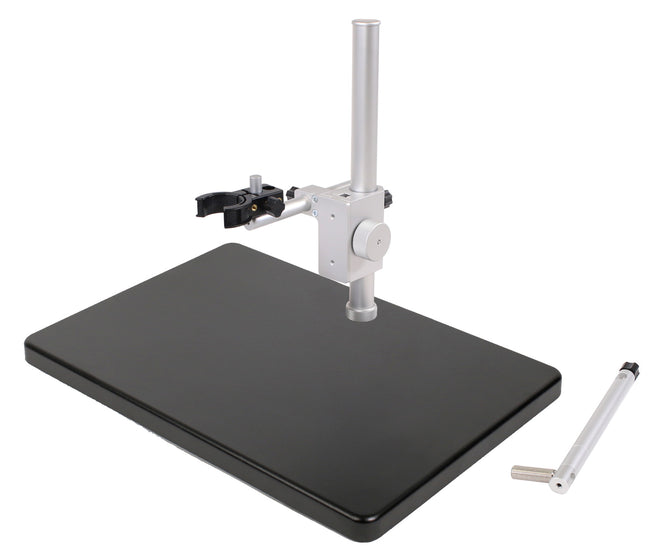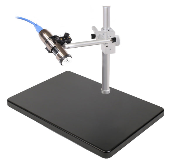 Tabletop boom MS36A-A2 stand with industrial style base designed for use with the complete line of Dino-Lite handheld microscope cameras (microscope sold separately) and comes complete with a Dino-Lite scope mount assembly with fine adjustment feature. This sturdy and versatile boom stand and wider base that utilizes an adjustable sliding horizontal boom arm with up to 10″ reach and 360-degree rotational capability making it ideal for inspection applications where the ability to extend out over and across a specimen is required. The precision machine crafted components provide smooth vertical and horizontal adjustment positioning in a well balanced and stable ergonomic design. Manufactured from a combination of resilient stainless steel and lightweight recycled aluminum, the MS36A-A2 can easily and conveniently be moved from one work area to another and endure the harshest of work environments (counterfeit ID, crime lab, etc), entertainment or simply as a reading aid