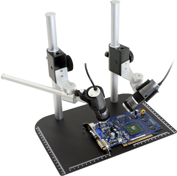 The MS37B-26 is a dual scope inspection stand with a single solid base. Each pole has the same block assembly as the MS36B which provides an adjustable boom arm for viewing over an area, rear set screw for vertical adjustment and a fine adjustment knob to help with precise focus adjustment. The black solid base has line gauges to aid in positioning and size references. Beneath the base are rubber grip stops to prevent sliding on working surfaces and to avoid possible scratch damage.