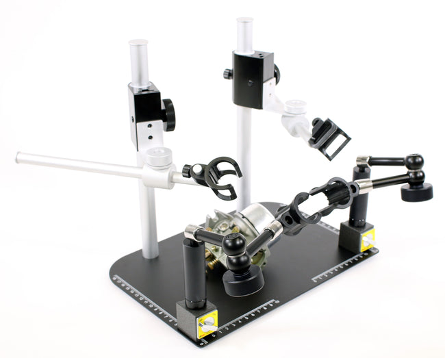 The MS37B-26MV2 is a quad scope (4 microscopes sold separately) inspection stand with a single solid base. This version includes 2 'single-lock arms' for multi-angled viewing and 2 boom arms. The 2 single-lock arms are connected to the base via switchable magnetic base. Beneath the base are rubber grip stops to prevent sliding on working surfaces and to avoid possible scratch damage.