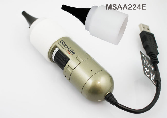 Viewing adapter designed to inspect the ear within a fixed working distance. Attach by simply sliding the adapter on the end of the Dino-Lite.