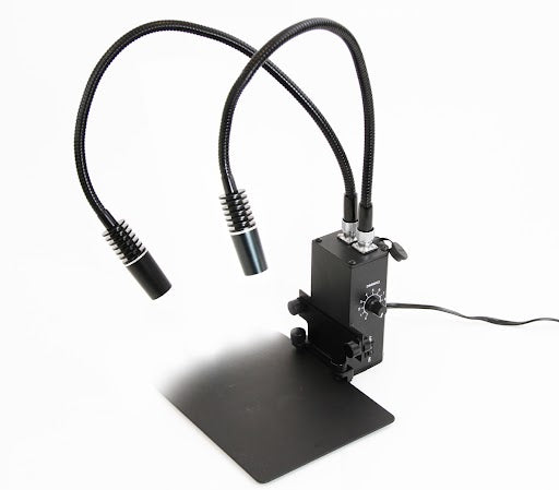 The MSAK813-UW supplemental light has UV 361nm LEDs on one arm and White LEDs on the other arm. This articulating spotlight can be used with the RK-10A stand for UV and white light with brightness controls. These very bright 361nm/white LED use flex arms that can be placed in any desired position and has a dimmer for 0-10 brightness control.