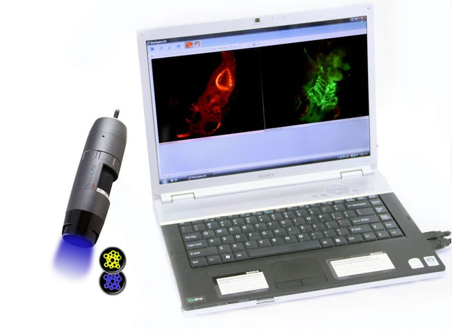 The Dino-Lite Edge AM4115T-GRFBY digital microscope is optimized for research and viewing objects involving fluorescent objects using 2 different sets of LED’s, 4 Blue LEDs at an excitation of 480nm and 4 Yellow LEDs at an excitation of 575nm which are switchable through the software, and emission at 510nm/610nm.